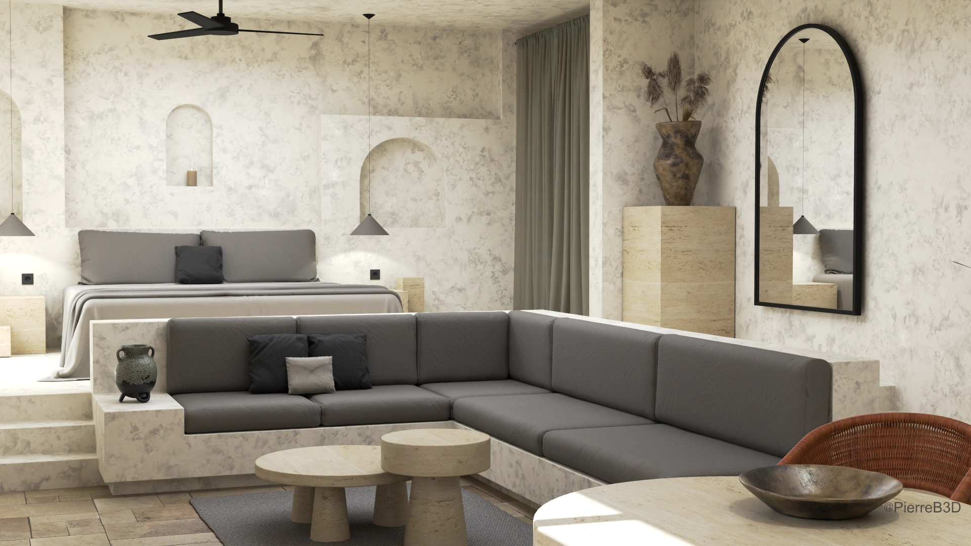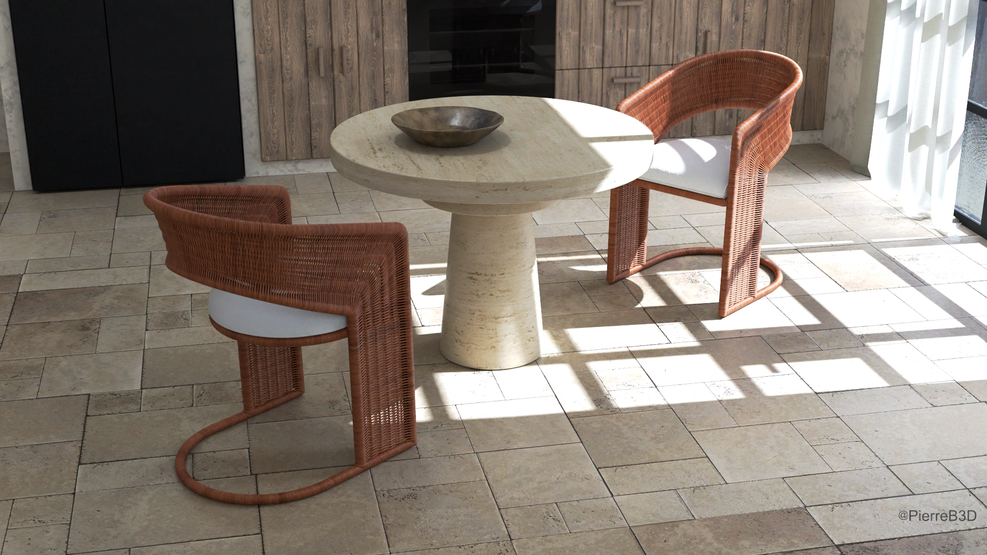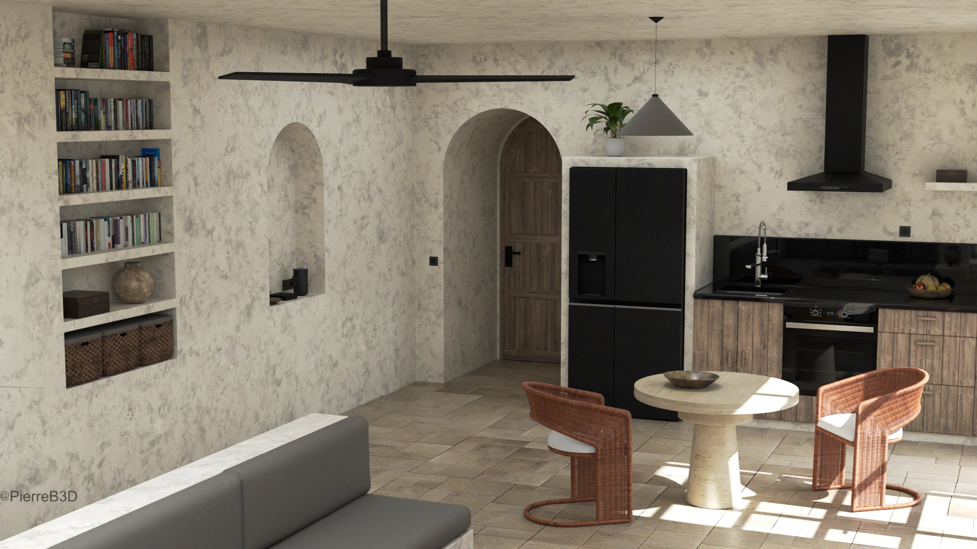 Challenge personnel sur la durée d’exécution. Inspiré d’un appartement fait tout en lignes droites, je voulais tester ma capacité à terminer un projet de cette envergure sur une durée la plus courte possible. J’ai modélisé et texturé tout les éléments sauf les plantes, les fruits, et les livres.